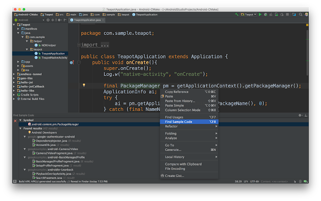 - Samples Browser: Referencing Android sample code is now even easier with Android Studio 2.2. Within the code editor window, find occurrences of your app code in Google Android sample code to help jump start your app development.